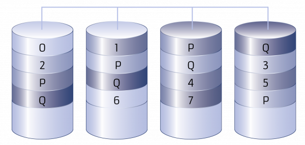 Durch des Ausfall einer Festplatte tritt bei RAID 5 noch kein Datenverlust auf. Durch die per XOR berechnete Parity (Parität), die wird über alle involvierten Festplatten (mindestens drei) hinweg geschrieben, kann die Ausfallsicherheit des RAID wiederhergestellt werden - selbst im laufenden Betrieb. Im Gegensatz zu einem RAID 1, bei dem alle Daten auf die neue Festplatte kopiert werden, müssen bei einem RAID 5 alle vorhandenen Daten der verbleibenden Festplatten gelesen werden, um die Daten per XOR zurück zu rechnen.